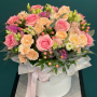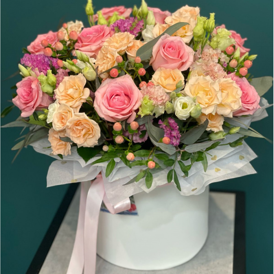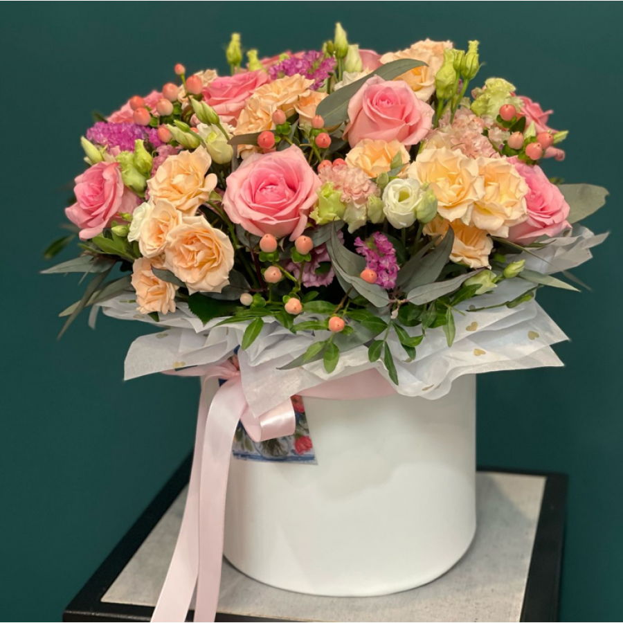Букет «Романтическая Палитра» — изысканная композиция из одноголовых роз, кустовых роз, эустомы, гиперикума, статицы, писташевой зелени и эвкалипта. Создана для тех, кто ценит нежность и элегантность. Букет сочетает в себе классическую красоту и современный стиль, идеально подходящий для любого особого случая.